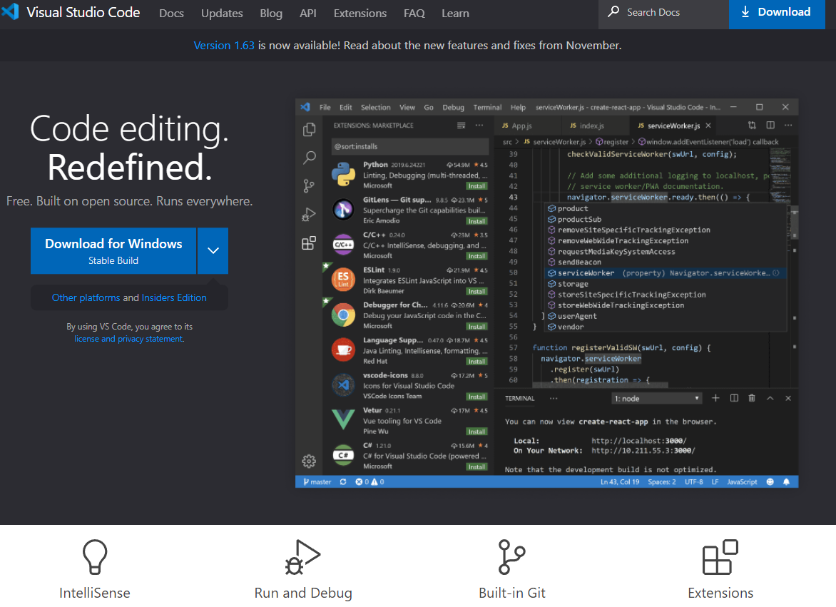 Visual Studio Code is a code editor redefined and optimized for building and debugging modern web and cloud applications. Visual Studio Code is free and available on your favorite platform - Linux, macOS, and Windows.