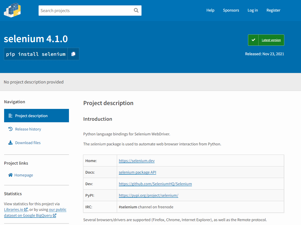 해당 패키지의 설치 명령어, Project Description, 버전 이력, 홈페이지 및 해당 패키지의 설명과 예제를 보실 수 있습니다.